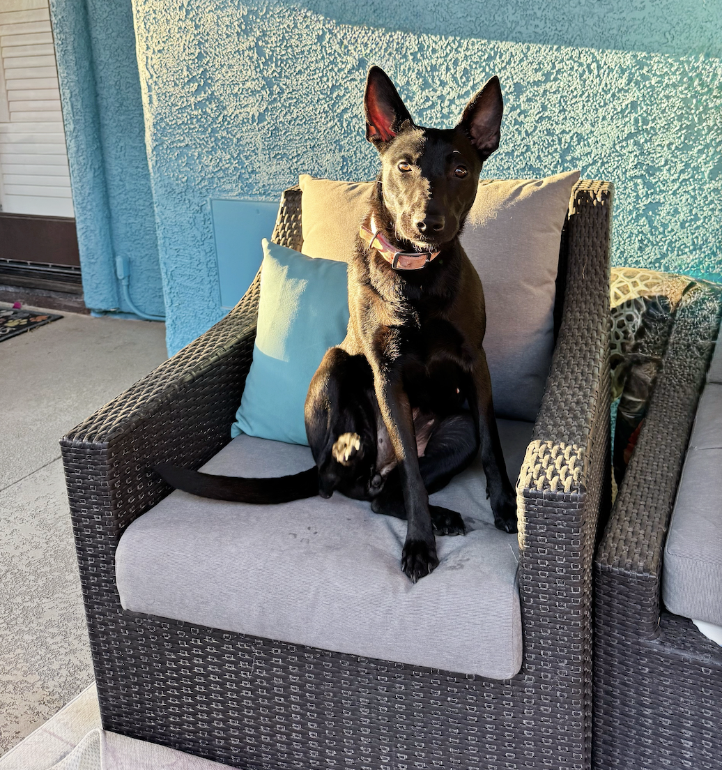 Monica came to the rescue 8 months ago as a week old puppy with her 5 other littermates. She was adopted by a family in Las Vegas when she was 14 weeks old, who had 40 years of dog ownership experience. Due to difficulty integrating their pack of pups, they have decided to rehome Monica (now named Juniper). Juniper and their small Shih Tzu did not get along.